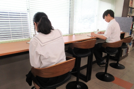ICT機器・ラーニングテーブルを設置し、利用しやすい環境づくりや読書キャンペーンなどの企画、授業と連携した展示を行い、生徒が「ワクワクする図書館」を目指しています。令和5年度「子供の読書活動優秀実践校」として文部科学大臣表彰を受賞しました。
